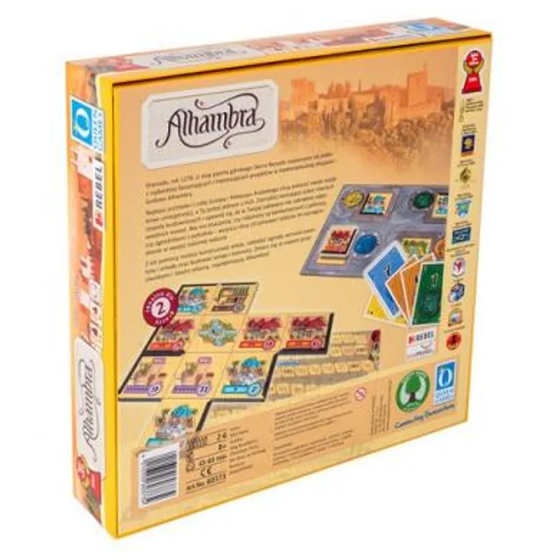 Igra koja će Vas držati zainteresovanim duže vreme, u kojoj ćete mrzeti svoje protivnike najviše na svetu ukoliko Vam uzmu željenu građevinu. Svaki igrač ima svoju strategiju kako doći do pobede, zato je i misaono izazovno igrati je, ali mnogo toga zavisi i od sreće – koja će se građevina pojaviti na tabli, koji novac možete da pokupite… Društvena igra Alhambra ima i ekspanzije koje menjaju igru taman toliko da vam ne dozvoljavaju da je ostavite.