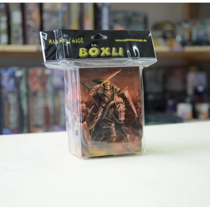 Skeleton Rider Max Protection vertikalna kutija je veličine za Magic: The Gathering i sve manje karticne igre i ima kapacitet da primi oko 90 karata sa slivovima. Otvara se sa gornje strane.