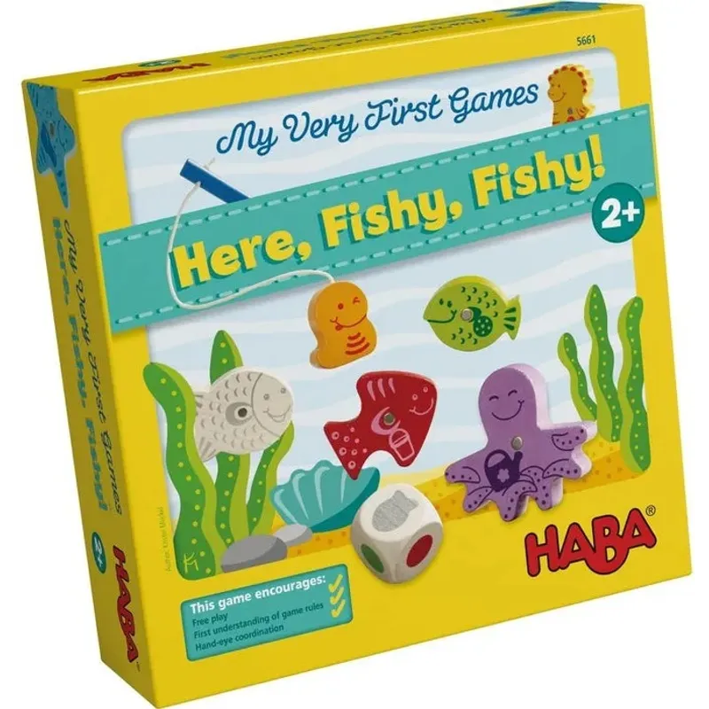 Fishing is fun in My First Game. Children experiment with the fishing rod, the sea, and all the funny sea creatures. During the game, they must catch a fish of the color that appears on the die. The one who successfully does this gets the fish and a piece of a beach set to assemble.