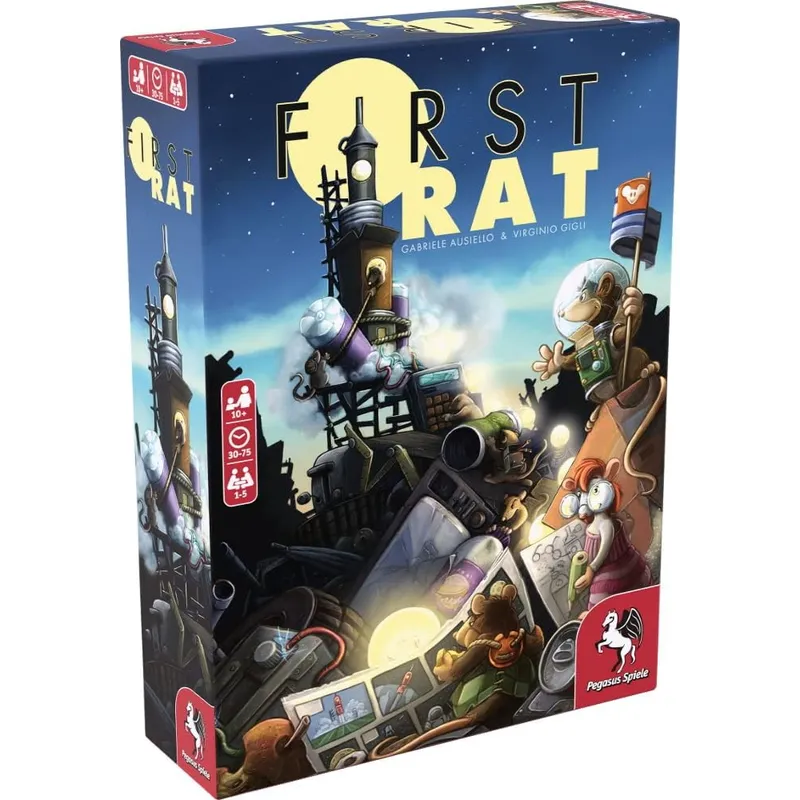 The board game First Rat tasks you with scoring the most points to win. To achieve this, you are compelled to collect resources like cheese, cans, apples, and various other scraps. But if you are on the same space as your fellow rat player, you will have to pay them—with cheese! Also, collect as many light bulbs as possible, as more light will make it easier for you to find more things. You have the freedom to steal, spend resources at the store to buy, for example, a backpack. When a player places their fourth rat on the spaceship—or places their eighth scoring marker on the board—the game ends, and the player with the most points wins.