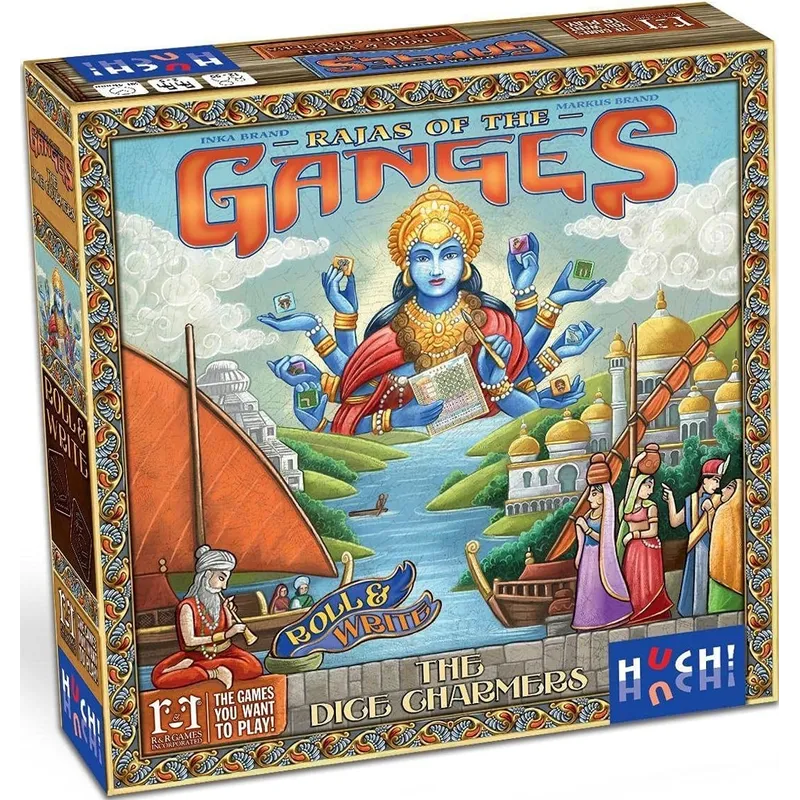 The board game Rajas of the Ganges: The Dice Charmers is the roll-and-write version of the board game Rajas of the Ganges. As in the base game, your goal is to achieve fame and wealth by developing your province as one of the influential people. This time, to achieve your goal, you will use dice to build, buy goods and sell them at the market, sail the Ganges River... Are you ready to reach for the stars once again?