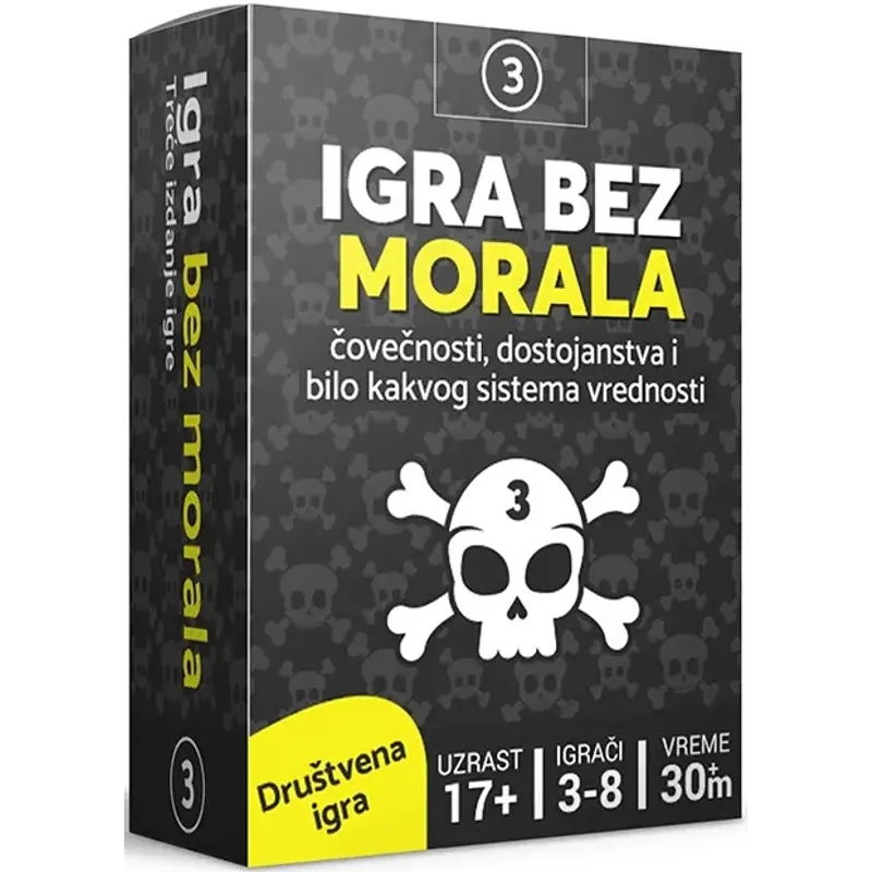The board game Igra Bez Morala 3. deo is a bizarre and fun game directed against humanity, dignity, and any system of values. Unlike other games of a similar type, this board game is as twisted as you and your friends combined. The game is quite simple: one player draws a card with a question, and all other players offer an answer with the most interesting card they have in hand. The player whose answer the question-setter liked the most gets a point, and the winner is the one who collects the most points. Is your mind 'strange' enough to collect points by answering all the tricky questions, or are there people in your company who have no boundaries when it comes to perversion? Find out by playing this peculiar game!