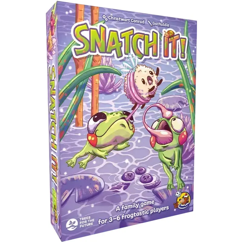 The board game Snatch It! is a family game for 3–6 players where the goal is to secure as much food as possible. Become a hungry frog and grab the tastiest cards from the pond. Protect your well-stocked piles from other greedy frogs trying to snatch them from you. Only those who secure their piles before they burst will not end up with an empty stomach. Are you ready for this challenge with plenty of frog food?