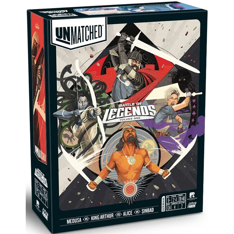 Unmatched: Battle of Legends, Vol. 1 features four heroes. King Arthur possesses powerful attacks and, with Merlin’s assistance, can become unstoppable. Alice has returned from Wonderland with her Vorpal Blade, growing and shrinking to adapt her fighting style depending on the enemy. Medusa will gladly fight anyone, and just one wrong move can be fatal for her opponent. Sinbad grows more powerful with every new voyage. Choose your hero and enter this wondrous battle!