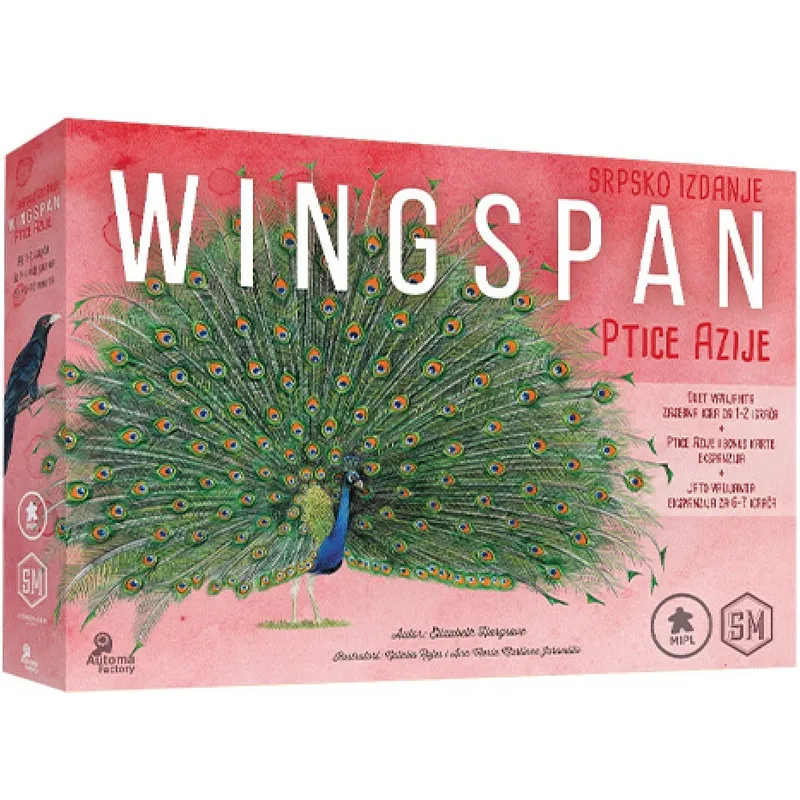 The board game Wingspan Asia (in Serbian) is a stand-alone game and simultaneously an expansion for the Wingspan board game that allows for several different ways to play: it can be played as a stand-alone game for 1 or 2 players (Duet Mode that can be used with any bird/bonus cards), it can be used as a card expansion for the original Wingspan game (bird/bonus cards from any Wingspan game or expansion can be combined), and a Flock Mode for 6–7 players is also available (which requires components from the base game).