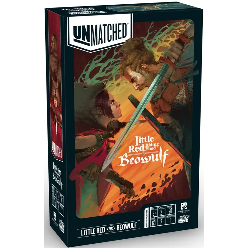 The board game Unmatched: Little Red Riding Hood vs. Beowulf is a miniature dueling game for two players, where each player has the chance to command one of these powerful heroes. Each hero is represented by a unique deck designed to capture their specific style and legend. The tactical combat you’ll find yourself in offers a unique experience that rewards those who use their skills wisely; however, just as you master one set, new heroes arrive to provide fresh matchups.