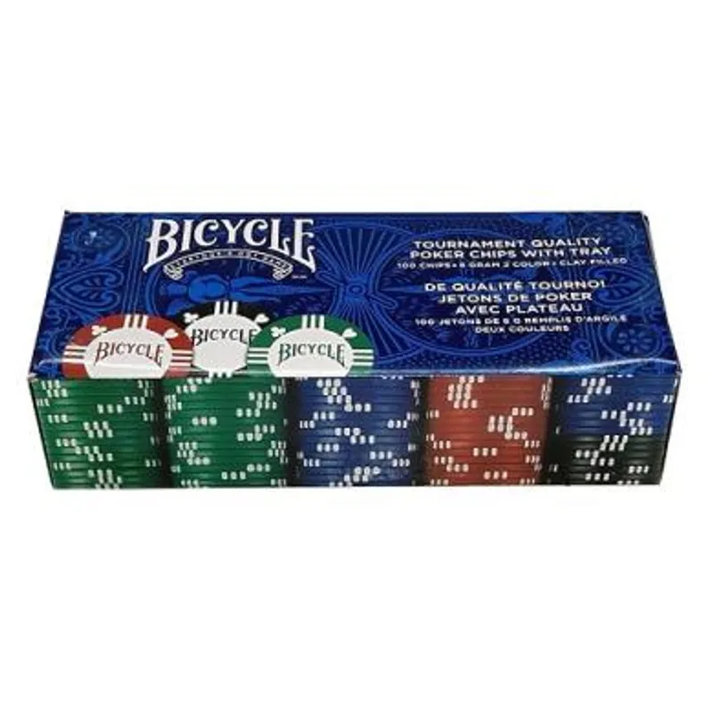 Bicycle Poker Chips su idealni žetoni za igranje pokera sa vašom porodicom i prijateljima kod kuće. Izrađeni su od kvalitetnog materijala (keramika oblozena plastikom) i svaki žeton teži 8 grama. Žetoni su dvobojni i imaju klasični "Casino" izgled. Kutija sadrži stalak i 100 žetona i to po 40 zeleno-belih žetona, 30 plavo-belih žetona, 20 crveno-belih žetona i 10 crno-belih žetona.