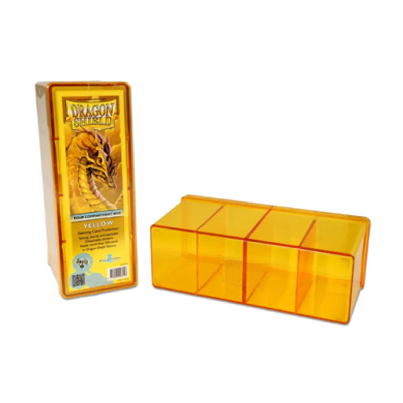 Sa Dragon Shield žutom kutijicom sa četiri zasebna odeljka možete sa sobom da ponesete i četiri svoja špila.. Odeljci su podeljeni tako da svaki odeljak pruža sigurnost za 80 karata u svojim slivovima. Kutijica je savršena za bilo koji TCG ili za bilo koju društvenu igru koja ima dosta karata. Dimenzije karata su standard (63×88 mm) ili japanske (small) (59×86 mm).