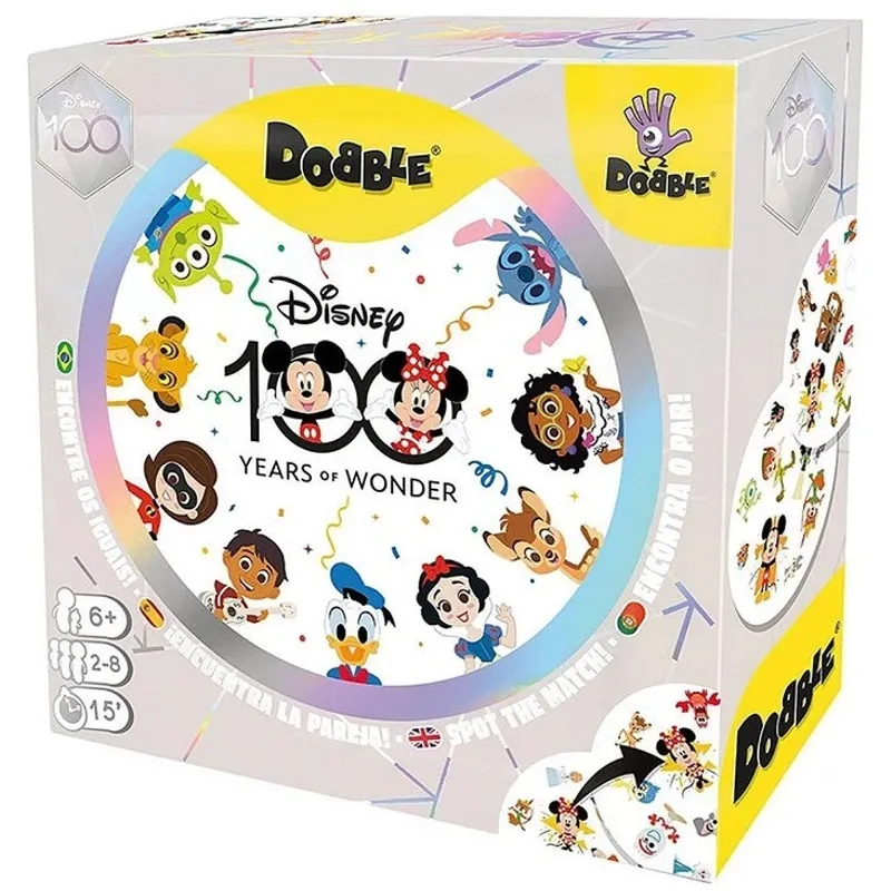 Dobble Disney 100 Years (na srpskom jeziku) je jednostavna igra prepoznavanja u kojoj igrači pokušavaju da nađu iste simbole prikazane na dve različite karte.
