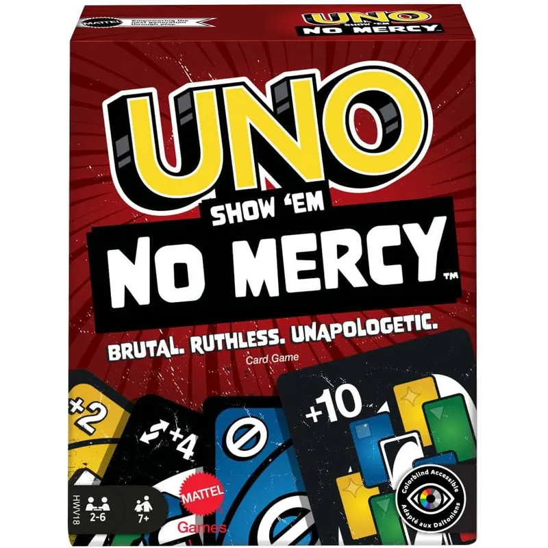 Zaboravite sve što znate o klasičnom UNO-u! UNO Show 'Em No Mercy je najbrutalnija, najnemilosrdnija i najluđa verzija omiljene kartaške igre koju ste ikada igrali! Ova edicija donosi toliko novih, paklenih pravila i karata da će svaka partija biti epska borba za preživljavanje. Ako mislite da ste majstor UNO-a, spremite se da testirate svoje veštine – i svoje prijateljstvo!