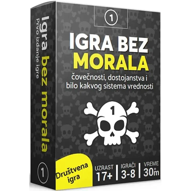 Društvena igra Igra Bez Morala 1.deo je bizarna i zabavna igra usmerena protiv čovečnosti, dostojanstva i bilo kakvog sistema vrednosti. Za razliku od ostalih igara sličnog tipa ova društvena igra je nastrana koliko Vi i Vaši prijatelji zajedno. Igra je priločno jednostavna, jedan igrač izvlači kartu na kojoj je pitanje a svi ostali igrači nude odgovor sa najzanimljivijom kartom koju imaju u ruci. Poen dobija onaj igrač čiji se ogovor najviše dopao igraču koji je postavio pitanje, a pobednik je onaj ko sakupi najviše poena. Da li je Vaš um dovoljno "čudan" da sakupite poene odgovarajući na sva škakljiva pitanja, ili u Vašem društvu postoje ljudi koji nemaju granice kada je u pitanju nastranost, saznajte igrajući ovu specifičnu igru!