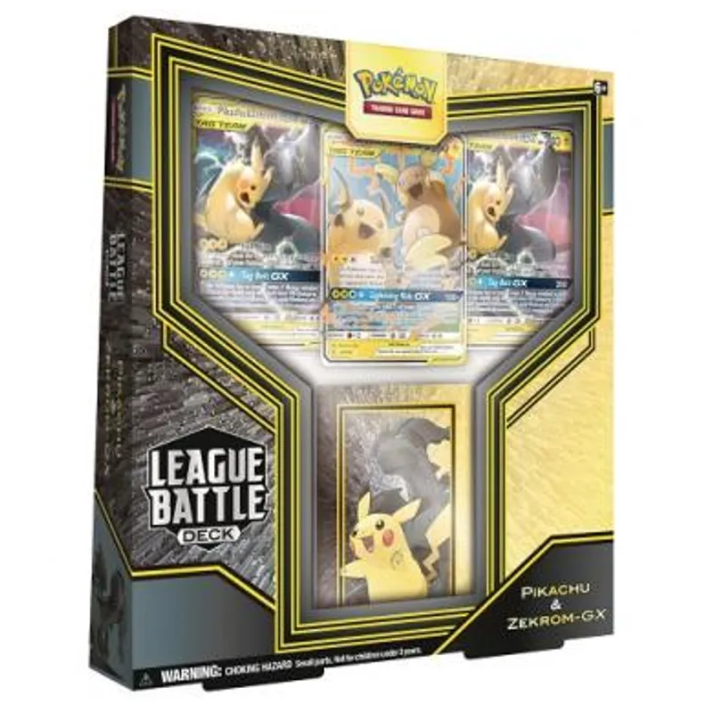 Na raspolaganju su vam dva League Battle špila, a svaki od njih dolazi sa neverovatnim TAG TEAM naelektrisanim Pikachu & Zekrom-GX-om ili vatrenim Reshiram & Charizard-GX-om. Svaki špil je obezbeđen moćnim kartama kao i glavnim Pokemonom, a sve to kako biste svoju igru podigli na viši nivo. U ovim već pripremljenim špilovima za igranje ćete takođe pronaći i 3 GX Pokemona, kao i ceo set pratećeg aksesoara za ozbiljnu Pokemon bitku!