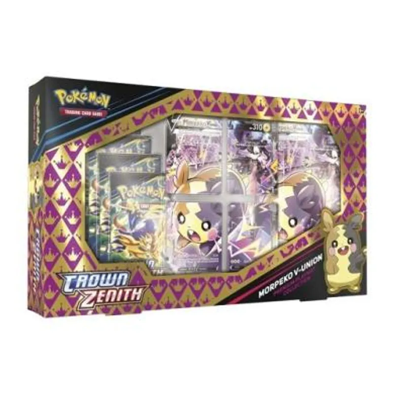 Sinhronizujte se sa svojim trenerom Marnie i veselim timom Yell, uz Morpeko koji juri u bitku kao šokantno moćan V-UNION Pokemon! Uz promotivne karte koje ćete pronaći u ovom Pokemon TCG Crown Zenith Morpeko V-UNION Premium Playmat Collection premium pakovanju, imaćete sve delove kako biste sastavili Morpeko V-UNION i moći ćete da sprovedete njegova četiri napada u akciju. Takođe ćete u ovom pakovanju pronaći podlogu za igranje sa motivom Morpeko i Marnie, kao i gomilu Pokemon TCG Crown Zenith booster pakovanja kako biste upotpunili svoju kolekciju.