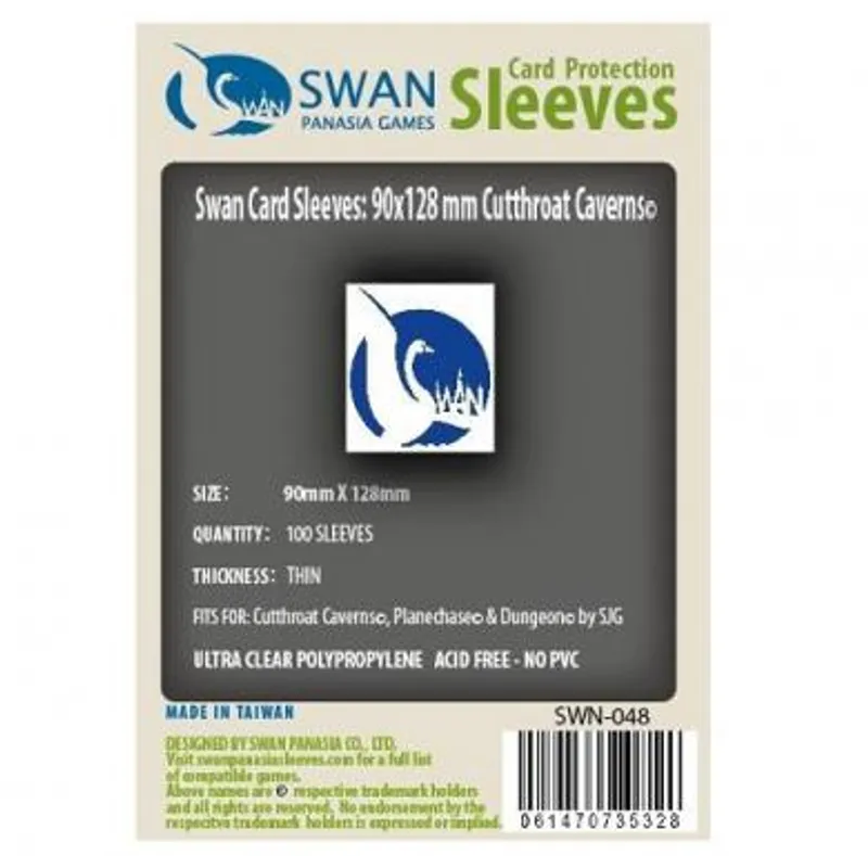 Swan SLeeves Velicina: 90mm x 128 mm Kolicina: 100 komada Odgovara za: Cutthroat Caverns, Dungeon, Tiny Epic Kingdoms..