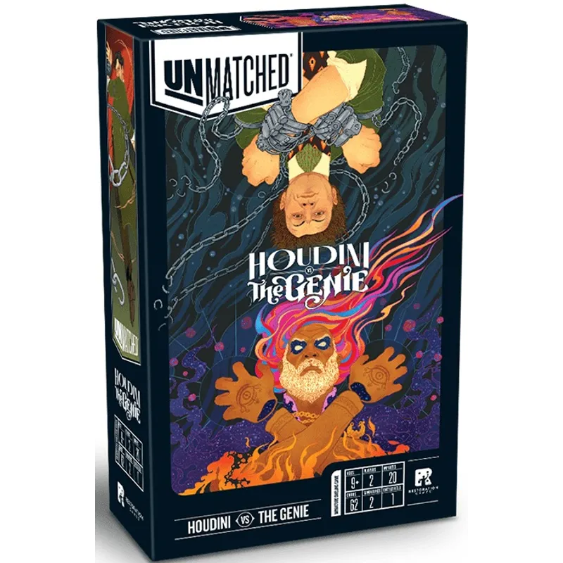 Društvena igra Unmatched Houdini vs The Genie je minijaturna borbena igra za dva igrača, u kojoj će svaki igrač imati priliku da upravlja jednim od moćnih heroja. Svaki heroj je predstavljen jedinstvenim špilom dizajniranim da dočara njegov stil i legendu. Taktička boba u kojoj ćete se naći pružiće Vam jedinstveno iskustvo koje nagrađuje one koji mudro koriste svoje veštine, ali baš kada savladate jedan set, stižu novi heroji da obezbede nove mečeve. Ova verzija igre uvodi dva nova heroja koja možete da kombinujete u ostalim igrama, a to su Harry Houdini i Duh iz Lampe!