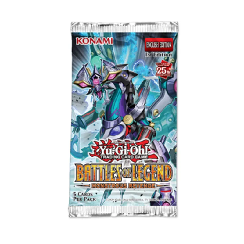 Battles of Legends set se nastavlja! Yu Gi Oh! Monstrous Revenge booster donosi nove moćne karte koje su se ranije pojavljivale samo u crtaćima, poput Golden Rule, ali i nove alternativne varijante karata iz Duel Monsters i GX ere poput Dark Magician the Knight of Dragon Magic, Armed Neos i Elemental HERO Flame Wingman - Infernal Rage. Reprinti popuralnih karata se takođe mogu naći u ovom setu poput P.U.N.K. arhetipa, kao i Brave arhetip karata poput Water Enchantress of the Temple i Rite of Aramesir, ali i moćni XYZ koji dominira metom duže vreme - Divine Arsenal AA-ZEUS - Sky Thunder! Kolekcionare će obradovati specijalne retke karte koje se mogu izvući u ovom setu. Povodom 25 godina igre, Konami je dodao određene karte u specijalnom reritetu - Quarter Century Secret Rare.