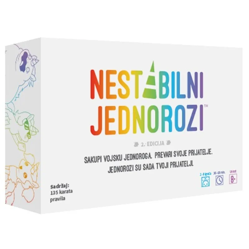 Društvena igra Unstable Unicorns(Nestabilni Jednorozi na srpskom jeziku) je strateška kartična igra koju čine dve stvari: Uništenje i Jednoroge!