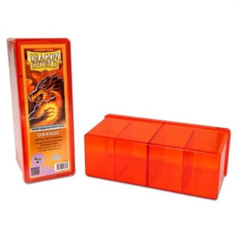 Sa Dragon Shield narandžastom kutijicom sa četiri zasebna odeljka možete sa sobom da ponesete i četiri svoja špila.. Odeljci su podeljeni tako da svaki odeljak pruža sigurnost za 80 karata u svojim slivovima. Kutijica je savršena za bilo koji TCG ili za bilo koju društvenu igru koja ima dosta karata. Dimenzije karata su standard (63×88 mm) ili japanske (small) (59×86 mm).