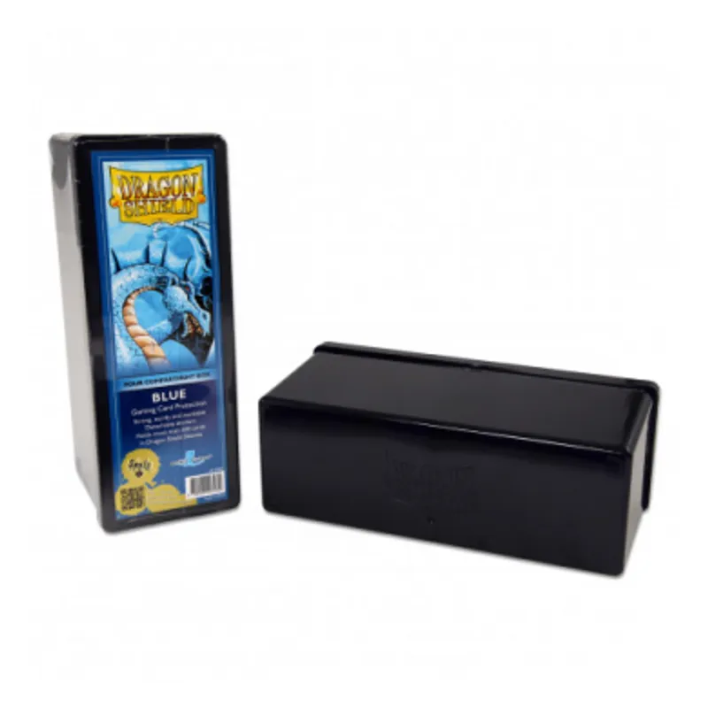 Sa Dragon Shield plavom kutijicom sa četiri zasebna odeljka možete sa sobom da ponesete i četiri svoja špila.. Odeljci su podeljeni tako da svaki odeljak pruža sigurnost za 80 karata u svojim slivovima. Kutijica je savršena za bilo koji TCG ili za bilo koju društvenu igru koja ima dosta karata. Dimenzije karata su standard (63×88 mm) ili japanske (small) (59×86 mm).
