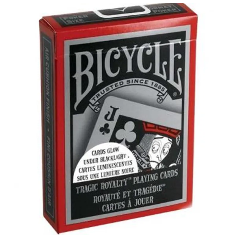 Tragic Royalty špil karata je dizajniran sa podebljanim crnom i crvenom poleđinom, kao i plačljivim, tužnim i jezivim plemićkim kartama. Najveće iznenađenje ove karte svetle u mraku!